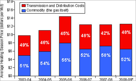 Because of the transportation infrastructure required to move natural gas to many diverse customers across a reasonably wide geographic area, distribution costs typically make up about half of natural gas costs for households and small volume customers. While large pipelines can reduce unit costs by transmitting large volumes of natural gas, distribution companies must deliver relatively small volumes to many more different locations. According to the Energy Information Administration (EIA), transmission and distribution costs represented about half of a typical residential natural gas customer’s monthly gas utility bill in 2009, with costs of the physical natural gas commodity itself representing the other half.